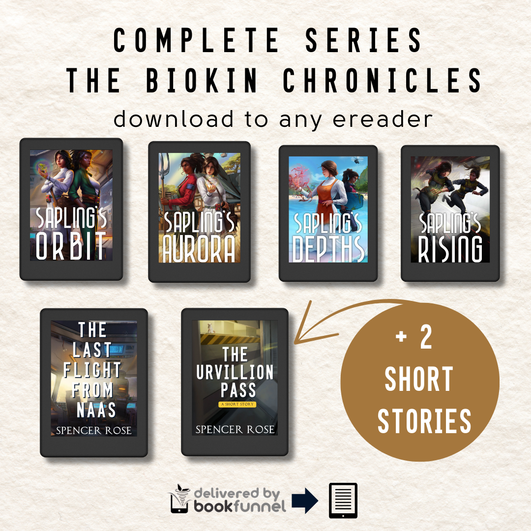 - The Biokin Chronicles Omnibus: all 4 novellas in the series: Sapling's Orbit, Sapling's Aurora, Sapling's Depths and Sapling's Rising (approx. 225 pages in total)